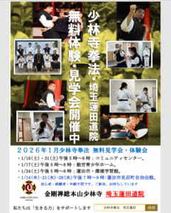 埼玉蓮田道院、2026年・令和8年1月の少林寺拳法 無料体験会・見学会を下記の日程で開催致します。